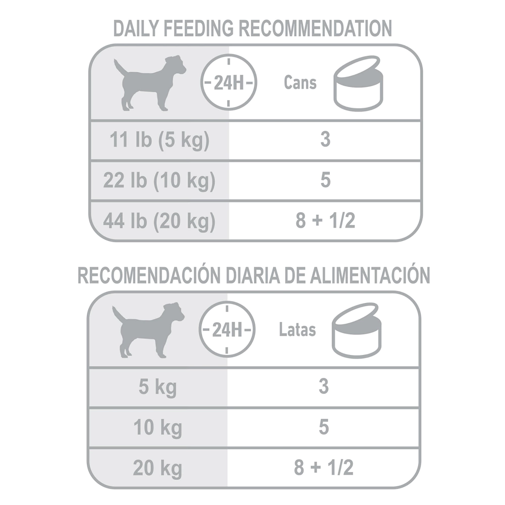 Alimentar a un perro de 10 kg (22 lb) con 2 latas al día o menos si se combina con comida seca. Ajústelo según sea necesario. Para obtener guías de alimentación personalizadas, póngase en contacto con nosotros o visite nuestro sitio web. Asegúrese de que dispone de agua potable fresca en todo momento. Tapar y refrigerar la porción no utilizada. (sólo 150 g) Para obtener guías de alimentación personalizadas, póngase en contacto con nosotros o visite nuestro sitio web. Refrigere la porción no utilizada. Si tiene alguna duda sobre la salud de su mascota, consulte a su veterinario. Si no está completamente satisfecho con este producto, póngase en contacto con nosotros. Conserve este producto en un lugar fresco y seco. Fecha de caducidad indicada en la parte inferior de la lata.